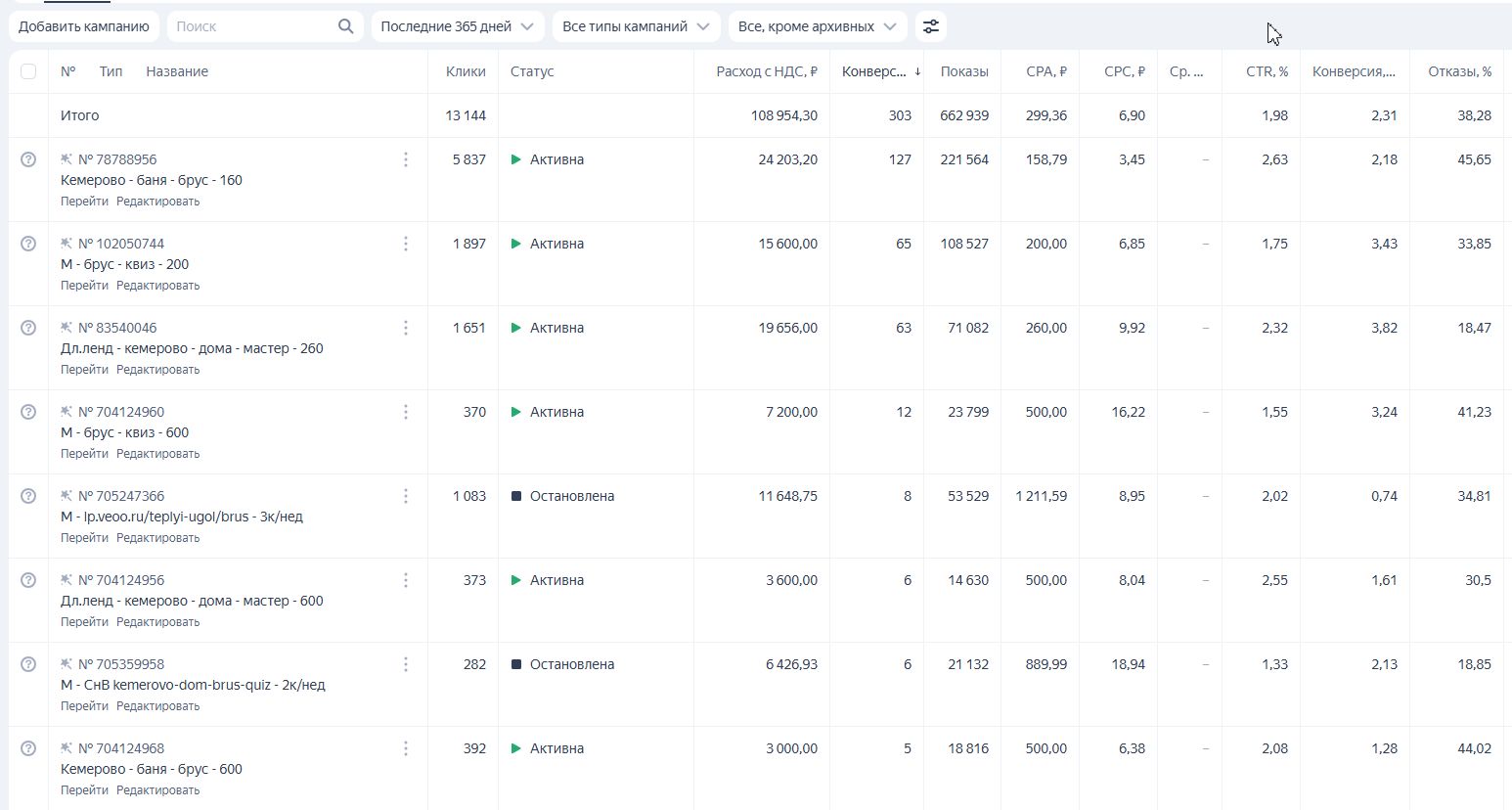 Начали в 2022 с утепления ППУ, но оказалось что основной бизнес - дома и бани из бруса. Переключились на них. И 3 года подряд ежемесячно вытягиваем несколько клиентов на строительство. Директ показывает статистику только за последний год, поэтому только она на скринах.